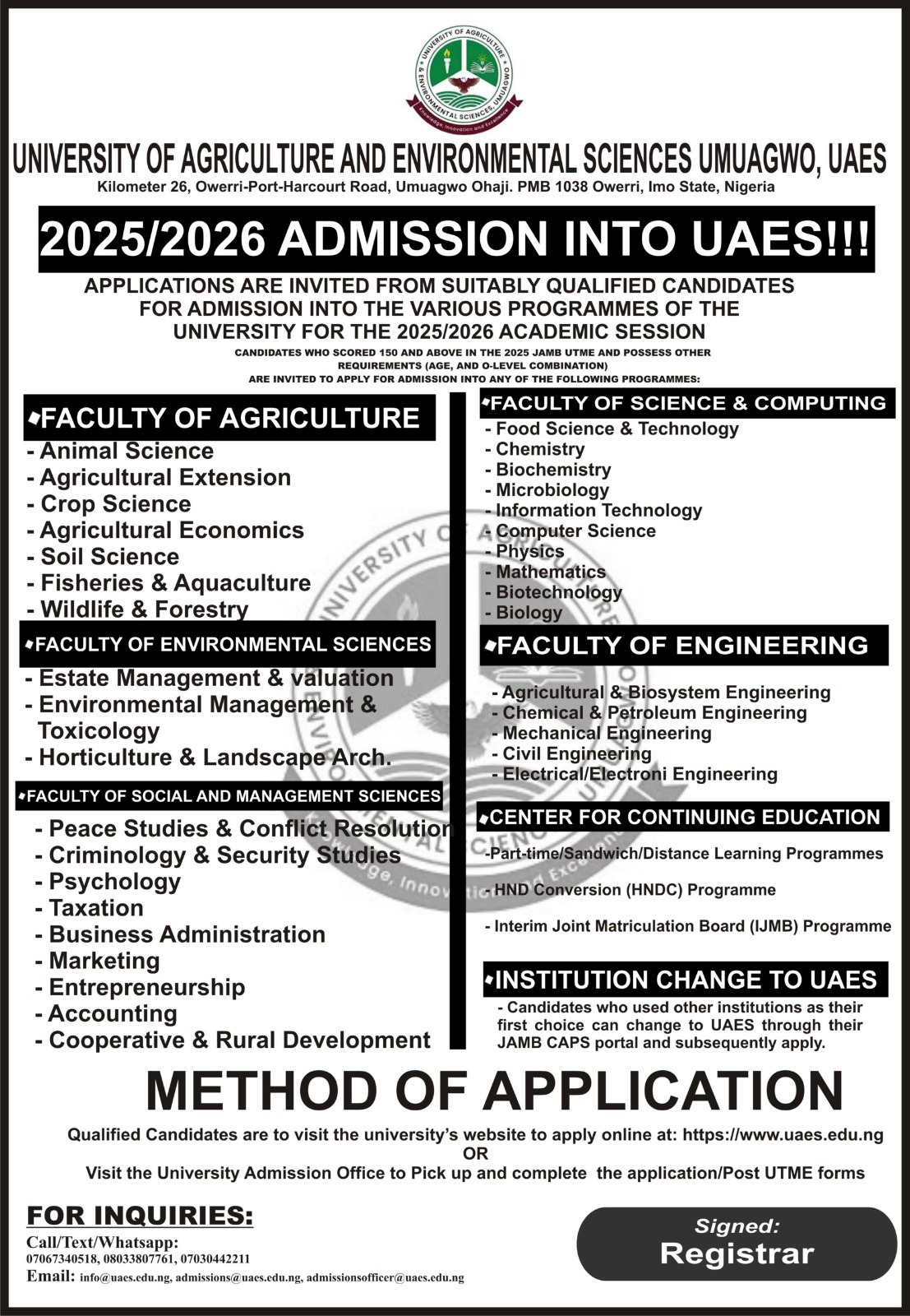UAES NOTICE O CLOSURE OF 2025/2026 ADMISSION EXERCISE