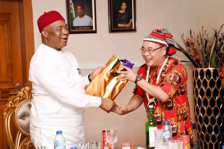 The Governor of Imo State, distinguished Senator, Hope Uzodimma Presents Gift to the leader of the team from Maejo University Thailand.